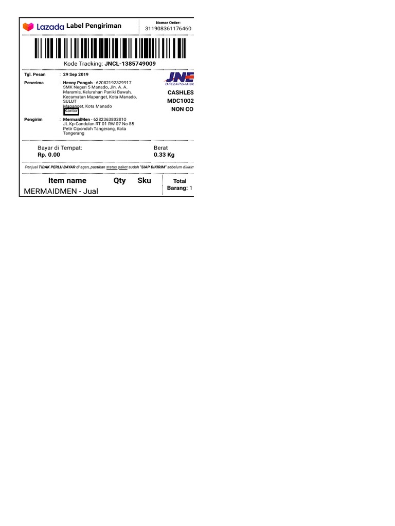 1.pilih beberapa pesanan yang ingin di cetak, setelah itu anda klik cetak "massal label pengiriman". Template label pengiriman sudah sesuai dengan yang di seller center versi terbaru. Oct 15, 2018 · ketika toko anda di lazada mendapat orderan sebaiknya segera dikemas dan diantar ke jne dengan sebelumnya diberi label detail konsumen. Untuk informasi lainnya seputar lazada bisa kamu simak disini. May 06, 2021 · itulah kurang lebih cara cetak invoice orderan / label pengiriman di lazada.